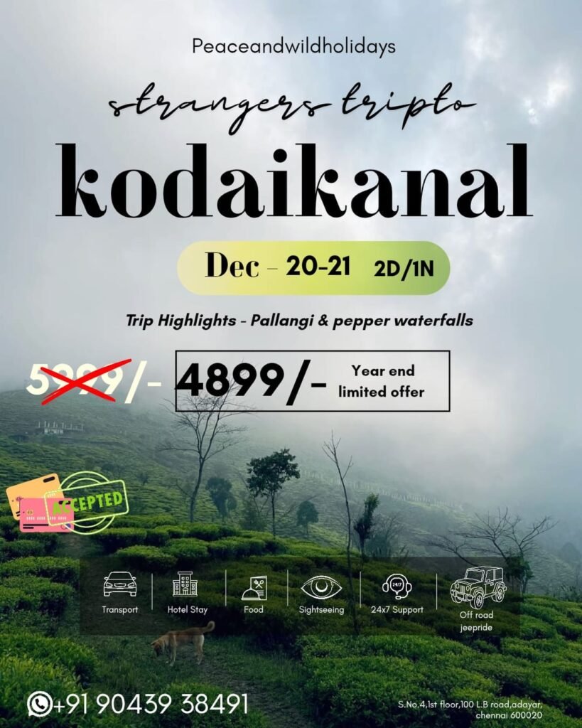 EXCELLENT Based on 5 reviews Posted on Angel Merry2026-04-06Trustindex verifies that the original source of the review is Google. I have traveled with Peace and Wild Holidays twice, and both experiences have been truly memorable. My first trip was to Aare Falls a few years ago, when Mr. Karthick had just started the company. It was a 2-day trip — trekking to Aare Falls on the first day, followed by a farm stay and an island visit on the second day. The trek was amazing, and the falls were absolutely magical. The farm stay was peaceful and refreshing, and the island visit — especially collecting seashells (which I still have!) — was such a special experience. The food throughout the trip was really good, especially the homemade meals at Aare Falls (Saravanan anna’s place) and at the fisherman’s homemade food on the island. A special mention to Mr. Rakesh, who guided us during the trip — he was extremely helpful and supportive(Carried water bottles and snacks to refresh us during trekking - poor guy). My second trip was a recent one to Kochi–Kumbalangi to witness bioluminescence. That experience was beyond words — I was literally screaming with excitement like a child! Seeing the glowing water felt magical, almost like something out of a fantasy. Night kayaking during this was an unforgettable experience. Even though it was a strangers’ group, we all bonded so well. We had so much fun kayaking and even danced together during the boat ride near Fort Kochi. Again, Mr. Rakesh guided us throughout the trip(Literally walking Google map), and Mr. Karthick ensured everything was perfectly arranged from pickup to drop. I didn’t have to worry about anything — every small detail was taken care of. The stay was comfortable and well organized. Thank you, Mr. Karthick, for creating such beautiful memories. This trip made me feel like a child again after many years. I absolutely loved the bioluminescence — honestly, I didn’t even feel like leaving the water! **Note:** Tamil vegetarian travelers may want to carry some food, as there are limited mid-range vegetarian options available around Kochi based on my experience.Posted on Bhanupriya Satishkumar2026-01-20Trustindex verifies that the original source of the review is Google. Very first time had this strangers trip experience, celebrated my hubby birthday and new year 2026. Lots of fun, new people introduction, DJ party, cultural programs, cake cutting, veg and non veg dinner and camp fire. Next day farm house visit saw lot of vegetables. The organizer was friendly. Had a safe and secured tripPosted on Naaga Pravallika2025-10-31Trustindex verifies that the original source of the review is Google. Good experience with their holiday packages in a reasonable budget and they take care of whole group from first to end of the trip with lot of patience. Thanks a lot PWH team🤩Posted on Deepak2025-09-18Trustindex verifies that the original source of the review is Google. 🤩